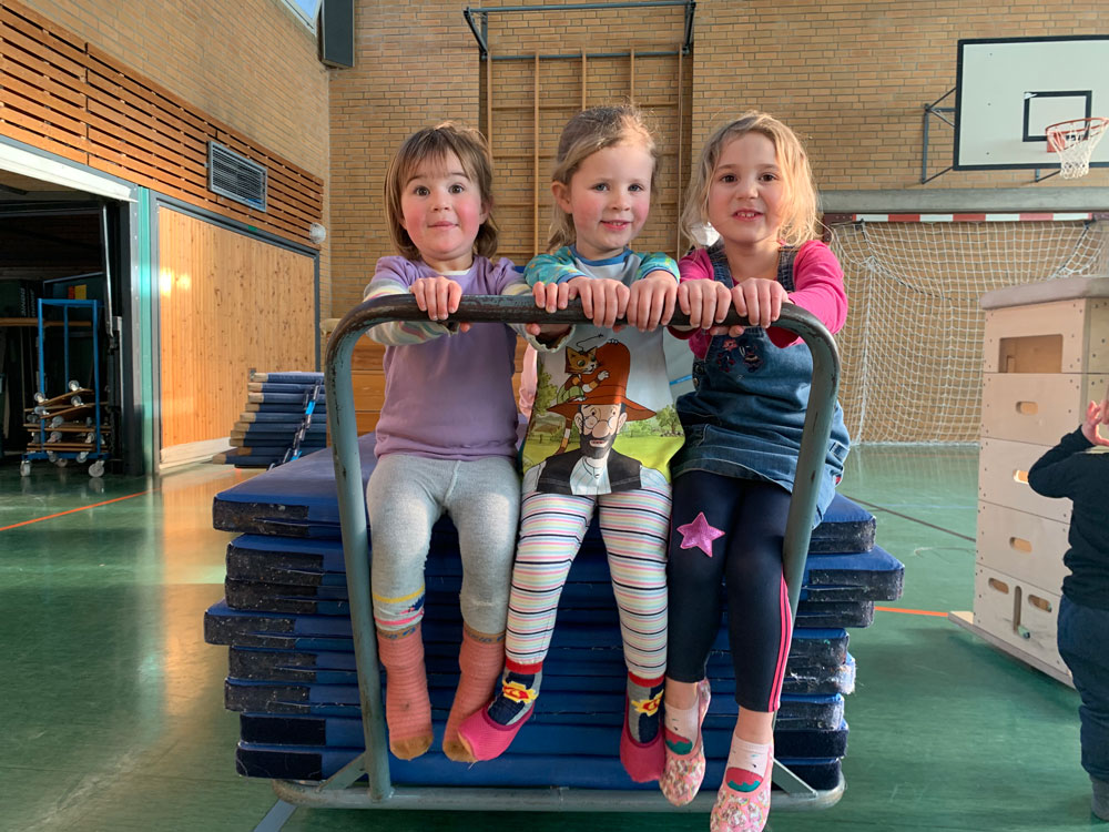 Wo die Kleinsten turnen, ist Action angesagt. Begrüßt wird sich mit fröhlichem Gesang und buntem Schwungtuch. Jeder schnappt sich ein Ende und dann wird „Karussell gefahren“ – erst langsam, dann immer schneller. Ein Riesenspaß! Jetzt dürfen alle die Gerätelandschaften erkunden: klettern, kullern, balancieren, rutschen, rennen, hangeln oder mutig den Sprung vom großen Kasten auf die dicke Matte wagen. Zum Auffangen sind ja notfalls Mama, Papa, Oma oder Opa da.