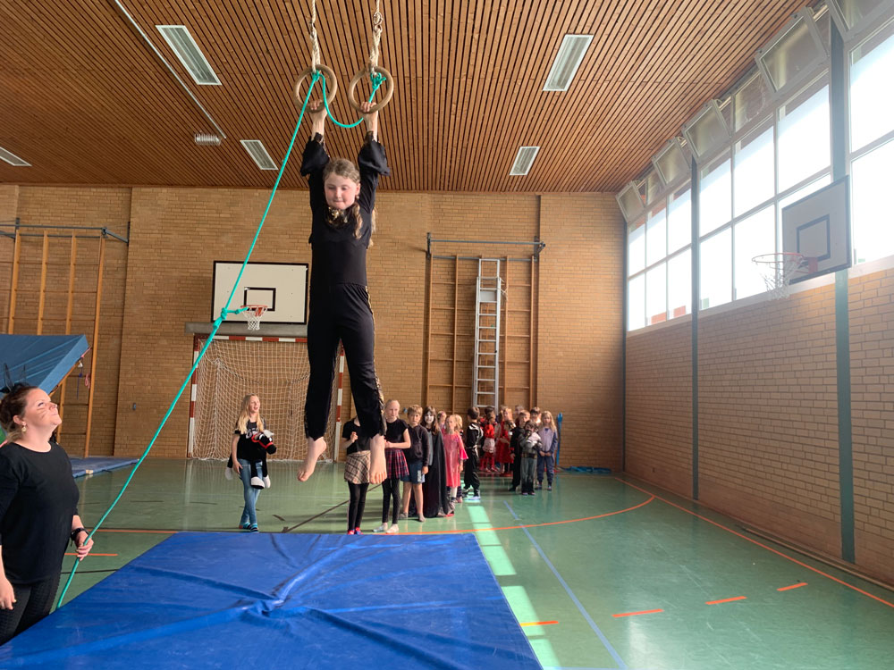 Verschiedene Bewegungsspiele stehen heute auf dem Programm und der heiß geliebte Stopptanz darf nicht fehlen. Es gibt eine Rutsche aus Matten. Und Schaukelringe, an denen die Kinder vom Trainer in die Höhe gezogen werden. Wie hoch, entscheidet jedes Kind für sich. Ein Meter? Zwei? Oder sogar drei? Dann heißt es loslassen – auch wenn der Boden mit dicken Matten gepolstert ist, braucht es dafür jede Menge Mut. Eigene Grenzen kennenlernen, über sich hinauswachsen – auch darum geht es beim Kinderturnen.