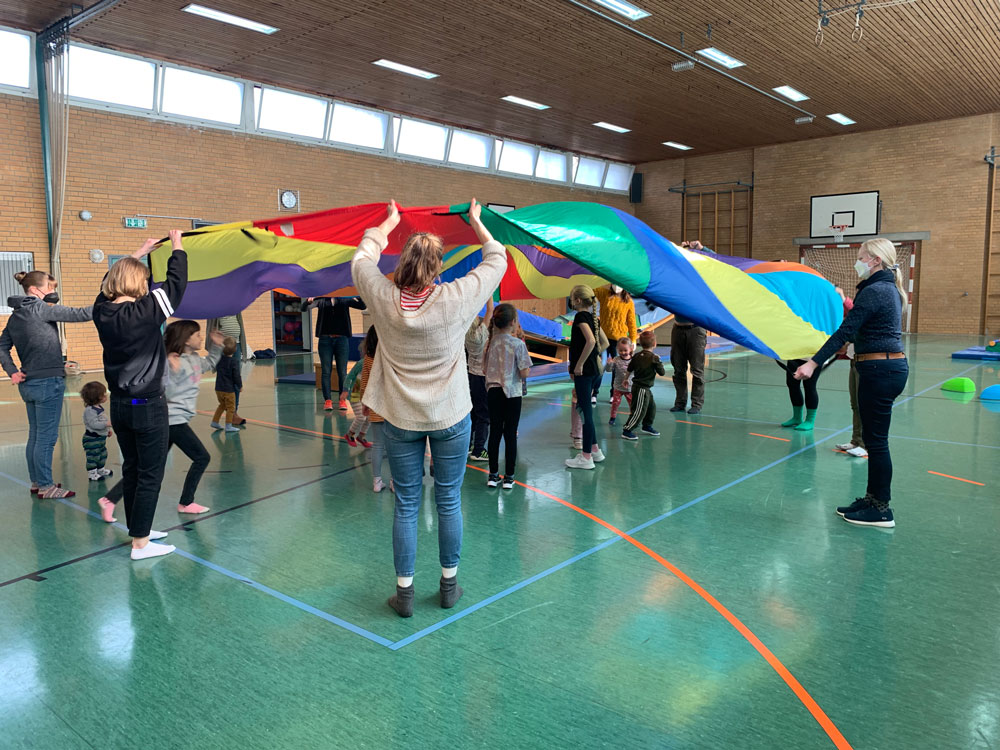 Wo die Kleinsten turnen, ist Action angesagt. Begrüßt wird sich mit fröhlichem Gesang und buntem Schwungtuch. Jeder schnappt sich ein Ende und dann wird „Karussell gefahren“ – erst langsam, dann immer schneller. Ein Riesenspaß! Jetzt dürfen alle die Gerätelandschaften erkunden: klettern, kullern, balancieren, rutschen, rennen, hangeln oder mutig den Sprung vom großen Kasten auf die dicke Matte wagen. Zum Auffangen sind ja notfalls Mama, Papa, Oma oder Opa da.