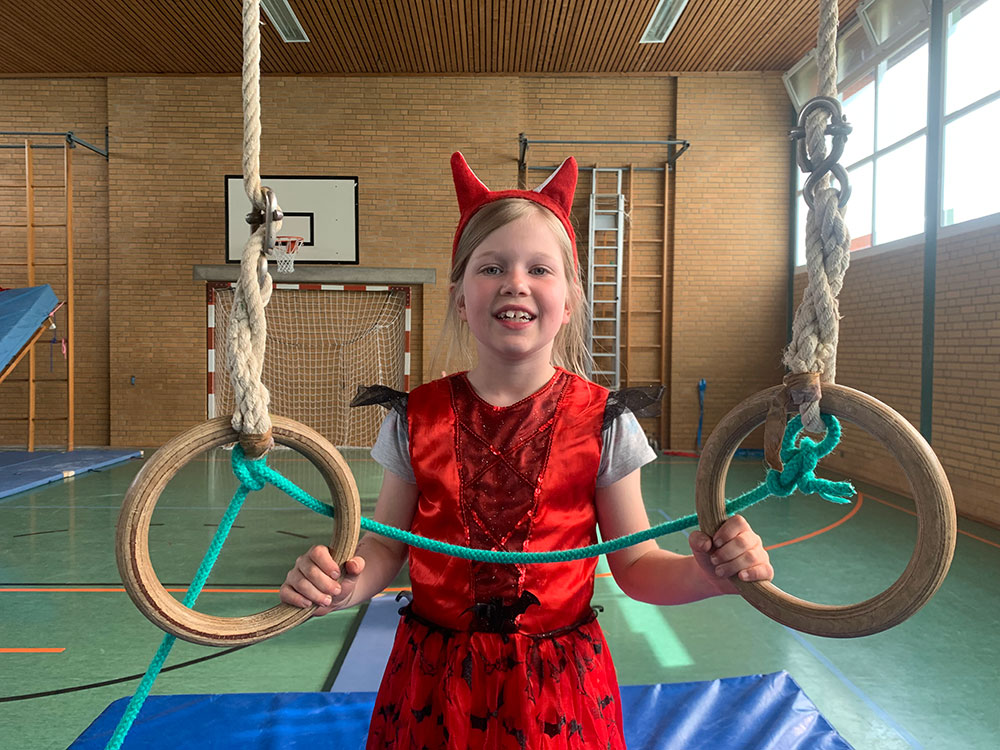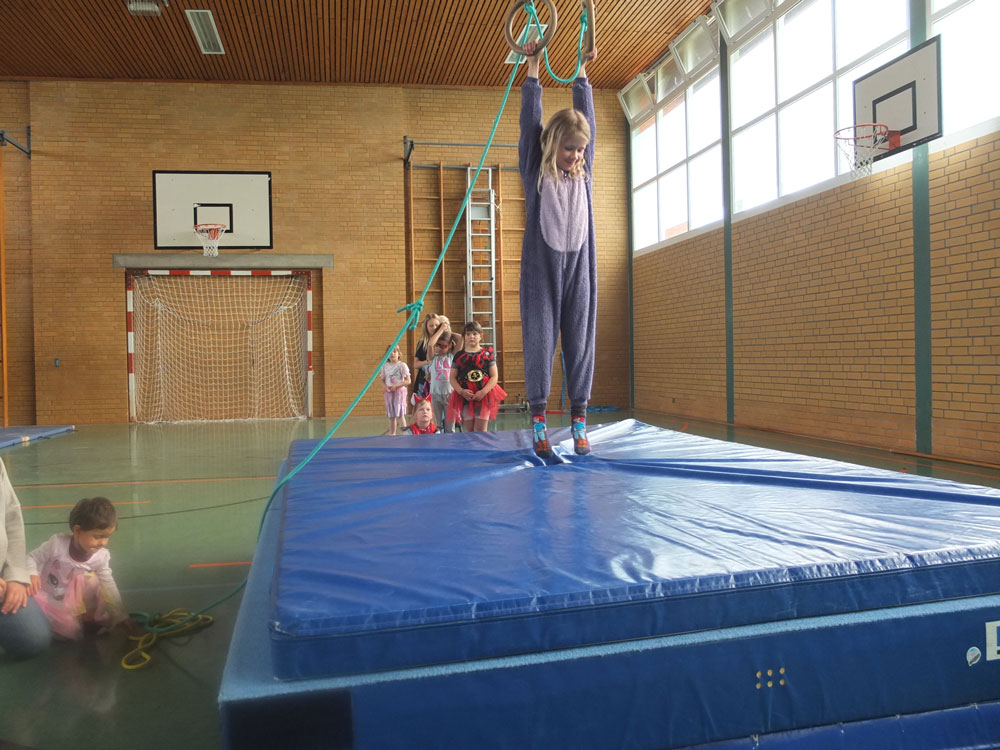 Verschiedene Bewegungsspiele stehen heute auf dem Programm und der heiß geliebte Stopptanz darf nicht fehlen. Es gibt eine Rutsche aus Matten. Und Schaukelringe, an denen die Kinder vom Trainer in die Höhe gezogen werden. Wie hoch, entscheidet jedes Kind für sich. Ein Meter? Zwei? Oder sogar drei? Dann heißt es loslassen – auch wenn der Boden mit dicken Matten gepolstert ist, braucht es dafür jede Menge Mut. Eigene Grenzen kennenlernen, über sich hinauswachsen – auch darum geht es beim Kinderturnen.